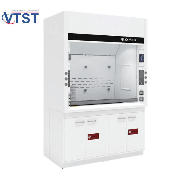 - Bệ đỡ tủ: Tủ hút đi kèm với bệ đỡ dạng tủ (cabinet), có khả năng kết nối với hệ thống xả khí, tạo điều kiện thuận lợi cho việc lưu trữ và xử lý hóa chất an toàn.